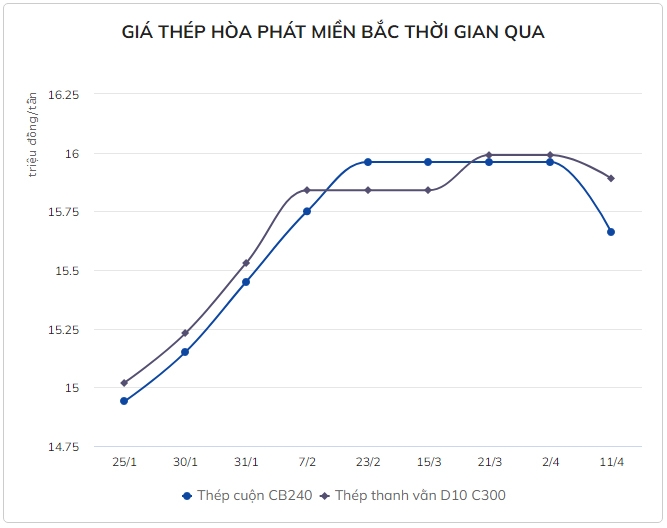 Còn, Hòa Phát điều chỉnh giảm 300.000 đồng/tấn đối với thép cuộn CB240 ở khu vực miền Bắc, sau điều chỉnh giá thép này về mức 15,66 triệu đồng/tấn. Tương tự, thép thanh vằn D10 CB300 giảm nhẹ 100.000 đồng/tấn, từ mức giá 15,99 triệu đồng/tấn còn 15,89 triệu đồng/tấn. Thép Hòa Phát miền Nam cũng có mức giảm tương tự.