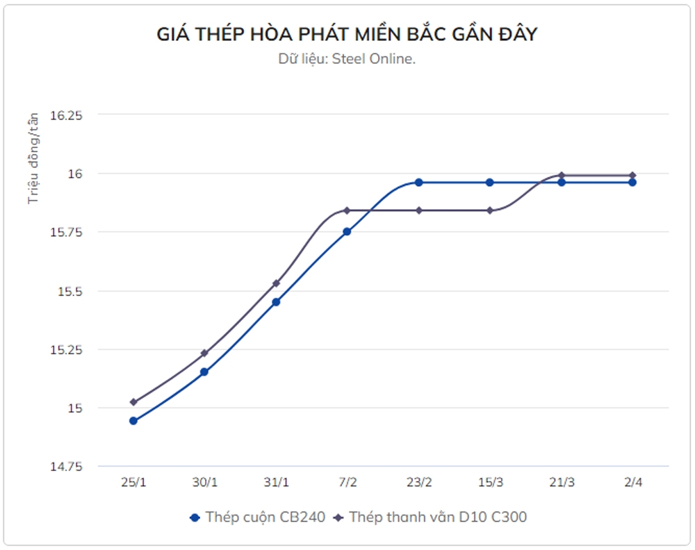 Trong thông báo mới đây, Công ty CP Tập đoàn Hòa Phát đã điều chỉnh tăng 150.000 đồng/tấn với dòng thép thanh vằn D10 CB300 ở khu vực miền Bắc và miền Nam. Sau điều chỉnh, giá thép ở hai miền lần lượt là 15,99 triệu đồng/tấn và 16,03 triệu đồng/tấn.