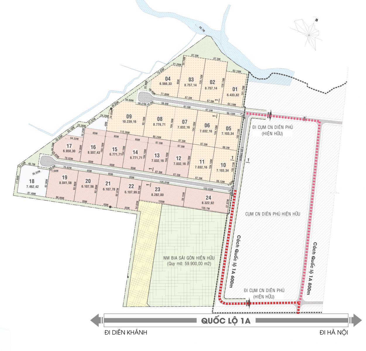 Đường giao thông gồm có đường nội bộ 2 làn 24- 28m và đường chính 4 làn 35m đảm bảo cho các xe có phân khối lớn có thể đi vào. Trong tương lai sẽ có tuyến đường mới xây dựng đi qua khu vực.