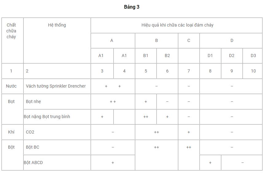 Hiệu quả chữa các đám cháy khi thiết kế hệ thống chữa cháy xem bảng 3.