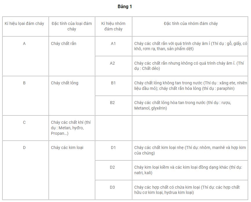 Loại và nhóm đám cháy được quy định trong bảng 1.